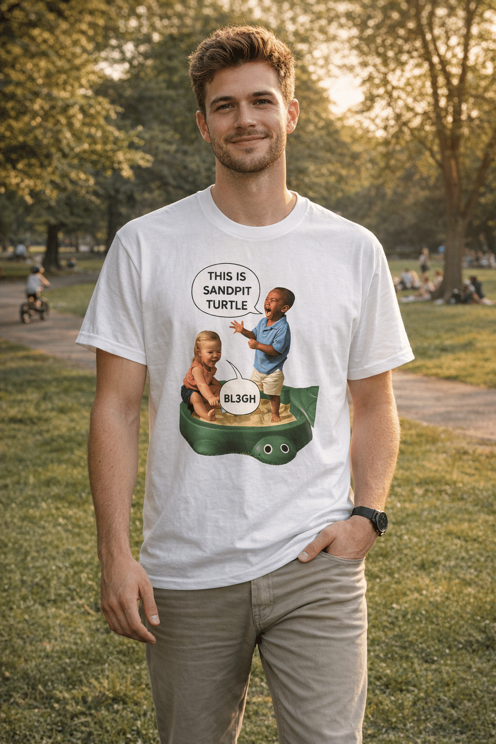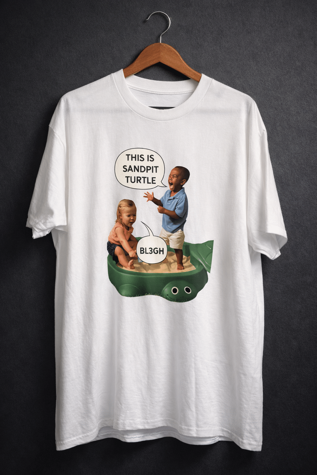 THIS IS SANDPIT TURTLE pulls from one of heavy music’s most infamous misheard lyrics and turns it into a wearable inside joke.